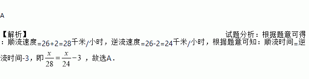 轮船沿江从A港顺流行驶到B港,比从B港返回A港少用3小时,若船速为26千米/时,水速为2千米/时,求A港和B港相距多少千米.设A港和B港相距x千米,根据题意,可列出的方程是( )