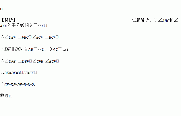 D 【解析】试题解析:∵∠ABC和∠ACB的平分线相交于点F, ∴∠DBF=∠FBC,∠ECF=∠BCF, 交AB于点D,交AC于点E. ∴∠DFB=∠DBF,∠CFE=∠BCF, ∴BD=DF=3,FE=CE, ∴CE=DE?DF=5?3=2. 故选D.
