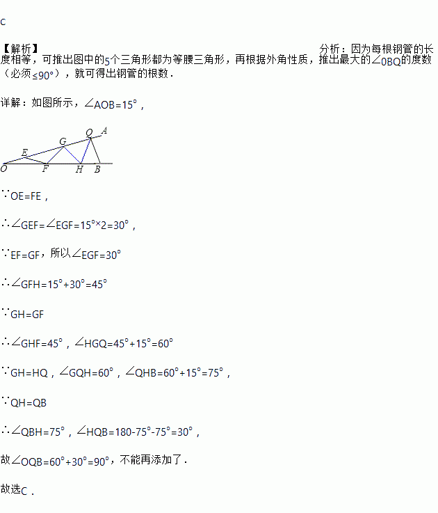 如图,∠AOB是一钢架,且∠O=15°,为使钢架更加牢固,需在其内部添加一些钢管EF、FG、GH、…,添加的钢管长度都与OE相等,则最多能添加这样的钢管( )