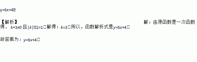 y=6x+4. 【解析】【解析】 由原函数是一次函数得, k+3≠0 且|k|﹣2=1,解得:k=3,所以,函数解析式是y=6x+4. 故答案为:y=6x+4.