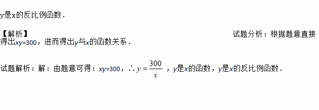 y是x的反比例函数. 【解析】试题分析:根据题意直接得出xy=300,进而得出y与x的函数关系. 试题解析:【解析】 由题意可得:xy=300,∴,y是x的函数,y是x的反比例函数.