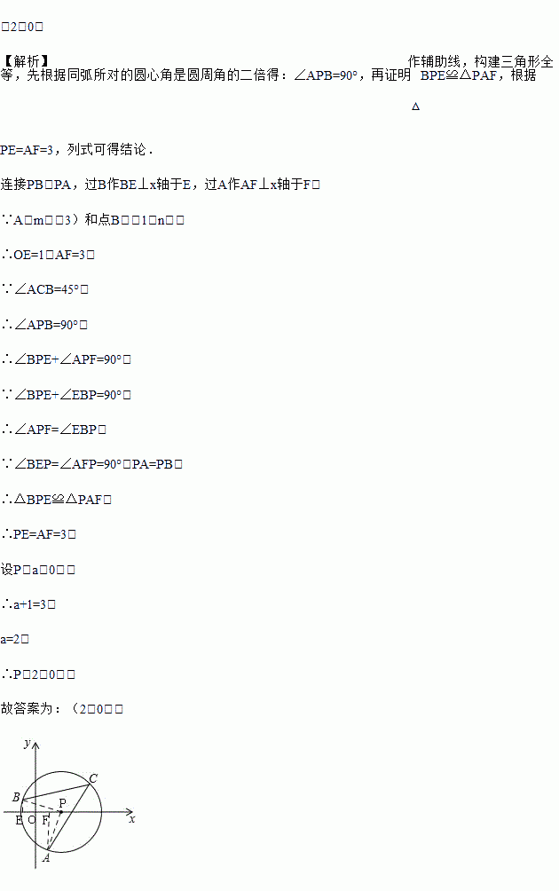 如图,在平面直角坐标系中,⊙P的圆心在x轴上,且经过点A(m,﹣3)和点B(﹣1,n),点C是第一象限圆上的任意一点,且∠ACB=45°,则⊙P的圆心的坐标是_____.