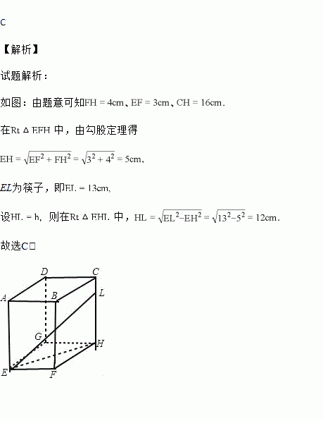 一支长为13cm的金属筷子(粗细忽略不计),放入一个长、宽、高分别是4cm、3cm、16cm的长方体水槽中,那么水槽至少要放进( )深的水才能完全淹没筷子.