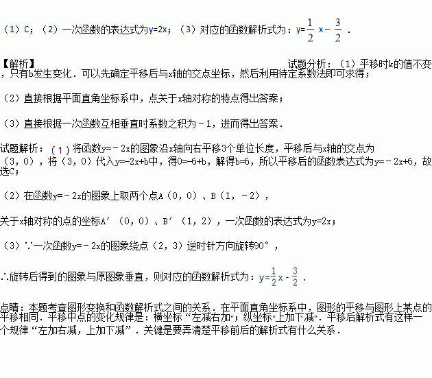 小尧阅读这段文字后有个疑问:把函数y=﹣2x的图象沿x轴向右平移3个单位长度,如何求平移后的函数表达式?