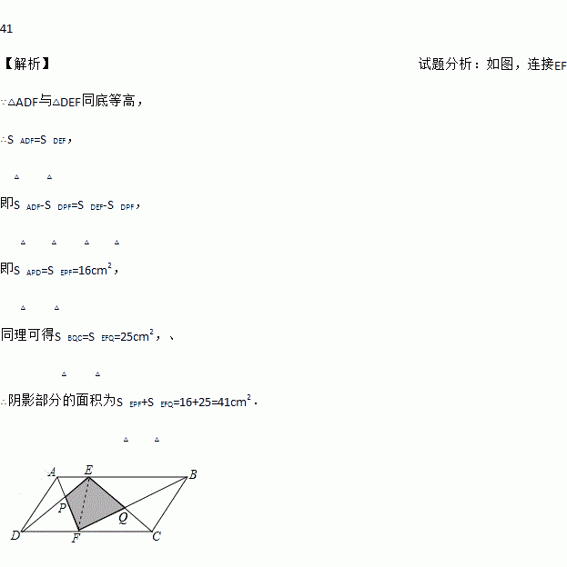 如图,在ABCD中,E、F分别是AB、DC边上的点,AF与DE相交于点P,BF与CE相交于点Q,若S△APD=16cm2,S△BQC=25cm2,则图中阴影部分的面积为__cm2.