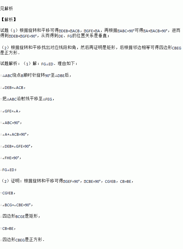 如图,已知在Rt△ABC中,∠ABC=90°,先把△ABC绕点B顺时针旋转90°后至△DBE,再把△ABC沿射线AB平移至△FEG,DE,FG相交于点H.