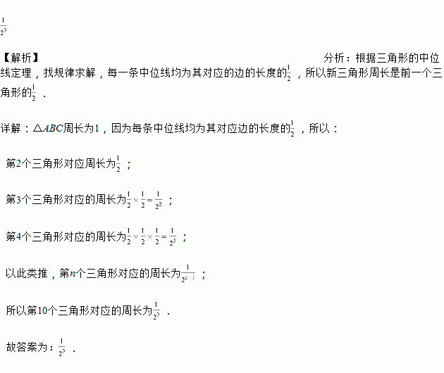 如图,已知△ABC的周长为1,连接△ABC三边的中点构成第二个三角形,再连接第二个三角形三边的中点构成第三个三角形,…,依此类推,则第10个三角形的周长为_____.