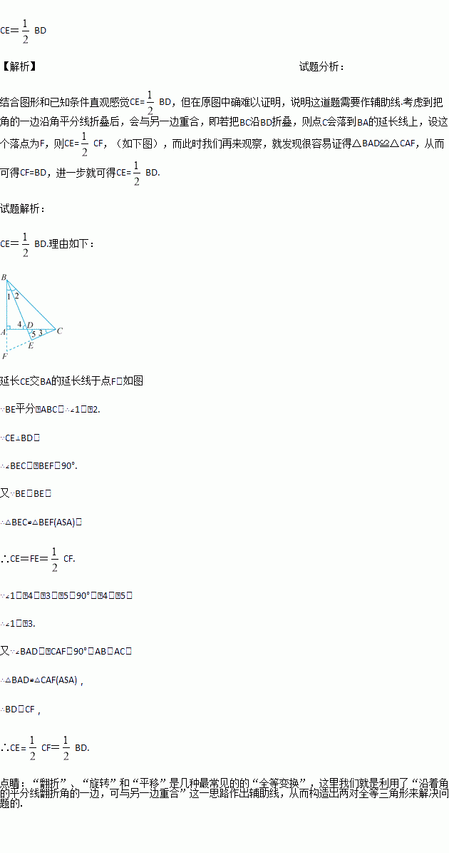 如图,在△ABC中,∠A=90°,AB=AC,∠ABC的平分线BD交AC于点D,CE⊥BD,交BD的延长线于点E.试猜想CE与BD的数量关系,并说明理由.