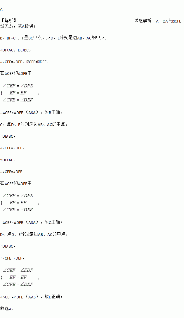 A 【解析】试题解析:A、∠A与∠CFE没关系,故A错误; B、BF=CF,F是BC中点,点D、E分别是边AB、AC的中点, ∴DF∥AC,DE∥BC, ∴∠CEF=∠DFE,∠CFE=∠DEF, 在△CEF和△DFE中 , ∴△CEF≌△DFE (ASA),故B正确; C、点D、E分别是边AB、AC的中点, ∴DE∥BC, ∴∠CFE=...