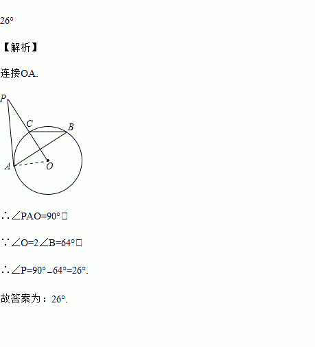 如图,PA与⊙O相切,切点为A,PO交⊙O于点C,点B是优弧CBA上一点,若∠ABC=32°,则∠P的度数为__.