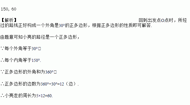 如图,小亮从点O出发,前进5m后向右转30°,再前进5m后又向右转30°,这样走n次后恰好回到点O处,小亮走出的这个n边形的每个内角是__________°,周长是___________________m.