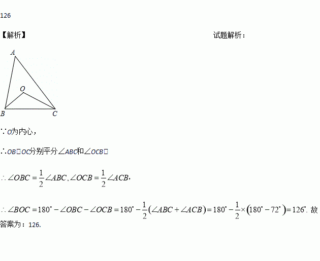 在△ABC中,∠A=72°,若O为内心,则∠BOC=_____°.