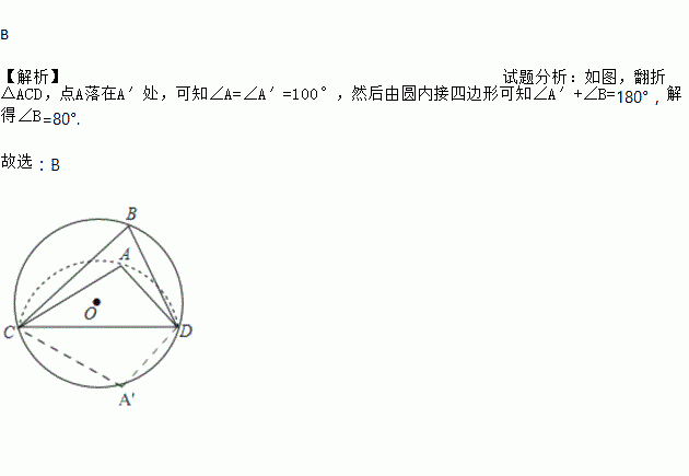 B 【解析】试题分析:如图,翻折△ACD,点A落在A′处,可知∠A=∠A′=100°,然后由圆内接四边形可知∠A′+∠B=180°,解得∠B=80°. 故选:B