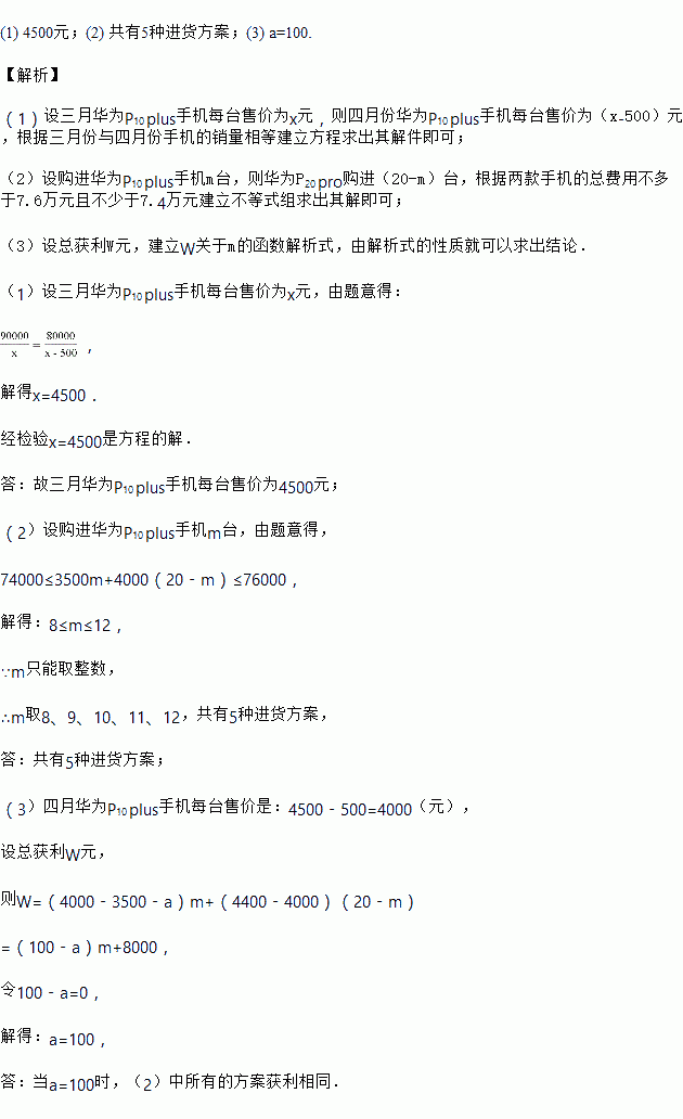 (2)为了提高利润,该店计划五月购进华为P20 pro手机销售,已知华为P10 plus每台进价为3500元,华为P20 pro每台进价为4000元,预计用不多于7.6万元且不少于7.4万元的资金购进这两种手机共20台,请问有几种进货方案?