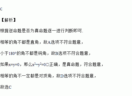 A. 直角都相等 B. 钝角都小于180° C. 如果x2+y2=0,那么x=y=0 D. 对顶角相等