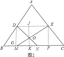 ②作EF⊥BC于F,如图2,由于EF=JK=4,CE=$\frac{1}{2}$AC=5,则CF=3,MF=8,分类讨论:当OM=ON时,根据等腰三角形性质得MK=MN=$\frac{1}{2}$x,证明△MOK∽△MEF,利用相似比得到OK=$\frac{1}{4}$x,然后利用△DOE∽△NOM得到$\frac{6}{x}$=$\frac{4-\frac{1}{4}x}{\frac{1}{4}x}$,解得x=10;当OM=MN=x,利用相似比可证得DE=EO=6,接着在Rt△MEF中利用勾股定理计算出ME=4$\sqrt{5}$,则x+6=4$\sqrt{5}$,所以x=4$\sqrt{5}$-6;当MN=ON=x时,同理得DO=DE=6,则DN=6+x,作DG⊥BC于G,如图2,易得DG=4,BG=3,GN=BM+MN-BG=x-2,然后在Rt△DNG中利用勾股定理得到∴42+(x-2)2=(x+6)2,解得x=-1(舍去),于是得到MN的长为10或4$\sqrt{5}$-6.