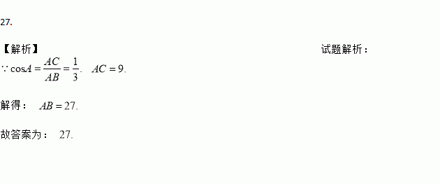 Rt△ABC中,∠C=90°,如果AC=9,cosA=,那么AB=_______