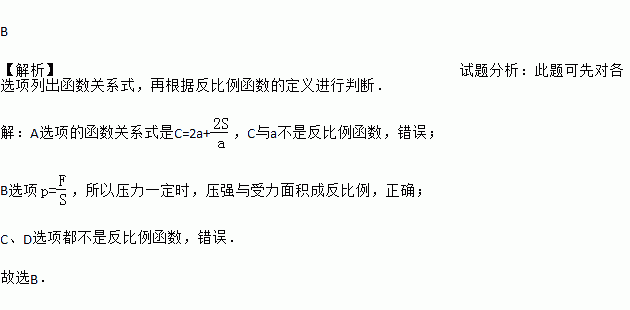 B 【解析】试题分析:此题可先对各选项列出函数关系式,再根据反比例函数的定义进行判断. 【解析】 A选项的函数关系式是C=2a+,C与a不是反比例函数,错误; B选项,所以压力一定时,压强与受力面积成反比例,正确; C、D选项都不是反比例函数,错误. 故选B.