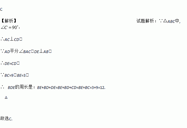 C 【解析】试题解析:∵△ABC中, ∴AC⊥CD, ∵AD平分∠BAC,DE⊥AB, ∴DE=CD, ∵BC=9,BE=3, ∴△BDE的周长是:BE+BD+DE=BE+BD+CD=BE+BC=3+9=12. 故选C.