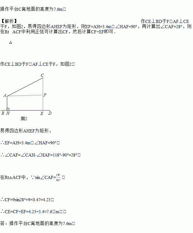 图1是一辆吊车的实物图,图2是其工作示意图,AC是可以伸缩的起重臂,其转动点A离地面BD的高度AH为3.4m.当起重臂AC长度为9m,张角∠HAC为118°时,求操作平台C离地面的高度(结果保留小数点后一位:参考数据:sin28°≈0.47,cos28°≈0.88,tan28°≈0.53)