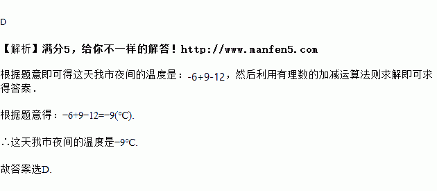 我市某天早上气温是﹣6℃中午上升了9℃,到了夜间又下降了12℃,这天我市夜间的温度是( )