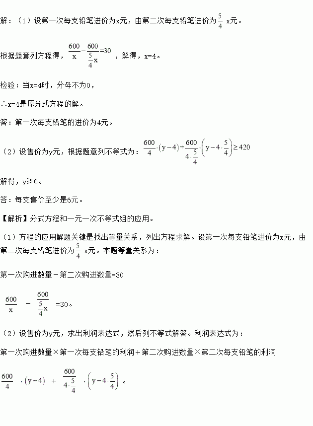 (2)若要求这两次购进的铅笔按同一价格全部销售完毕后获利不低于420元,问每支售价至少是多少元?