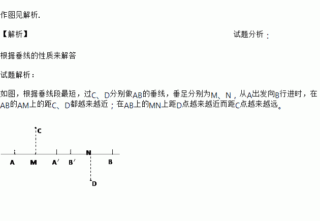 ×÷ͼ¼û½âÎö. ¡¾½âÎö¡¿ÊÔÌâ·ÖÎö£º ¸ù¾Ý´¹ÏßµÄÐÔÖÊÀ´½â´ð ÊÔÌâ½âÎö£º Èçͼ£¬¸ù¾Ý´¹Ïß¶Î×î¶Ì£¬¹ýC¡¢D·Ö±ð×öABµÄ´¹Ïߣ¬´¹×ã·Ö±ðΪM¡¢N£¬´ÓA³ö·¢ÏòBÐнøÊ±£¬ÔÚABµÄAMÉϵľàC¡¢D¶¼Ô½À´Ô½½ü£»ÔÚABÉϵÄMNÉϾàDµãÔ½À´Ô½½ü¶ø¾àCµãÔ½À´Ô½Ô¶¡£