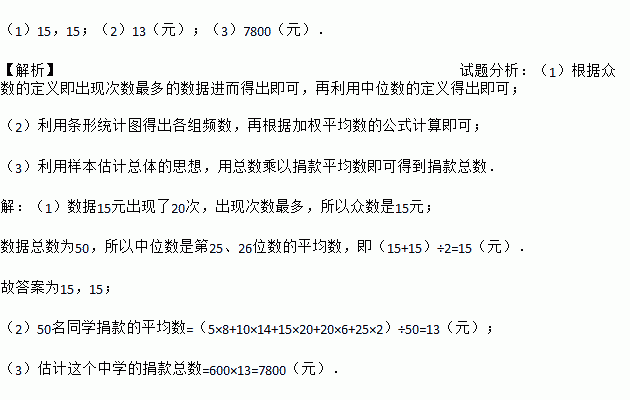 (1)15,15;(2)13(元);(3)7800(元). 【解析】试题分析:(1)根据众数的定义即出现次数最多的数据进而得出即可,再利用中位数的定义得出即可; (2)利用条形统计图得出各组频数,再根据加权平均数的公式计算即可; (3)利用样本估计总体的思想,用总数乘以捐款平均数即可得到捐款总数. 【解析】 (1)数据15元出现了20次,出现次数最多,所以众数是15元; ...
