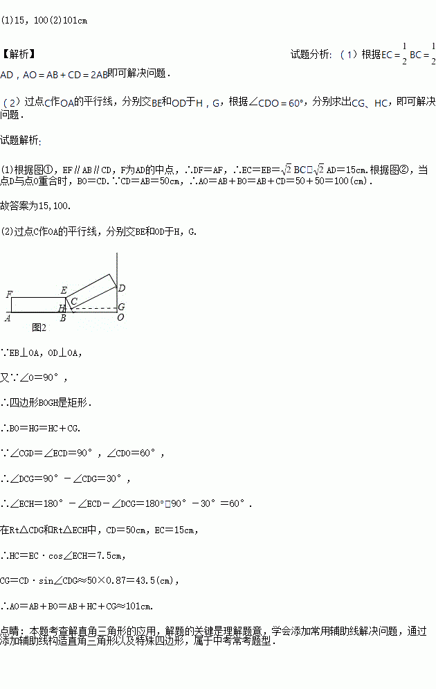 如图①所示的旅行箱的箱盖和箱底两部分的厚度相同,四边形ABCD为形如矩形的旅行箱一侧的示意图,F为AD的中点,EF∥CD.现将放置在地面上的箱子打开,使箱盖的一端点D靠在墙上,O为墙角,图②为箱子打开后的示意图.箱子厚度AD=30cm,宽度AB=50cm.