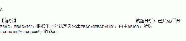 如图,AB∥CD,AD平分∠BAC,若∠BAD=70°,则∠ACD的度数为( )