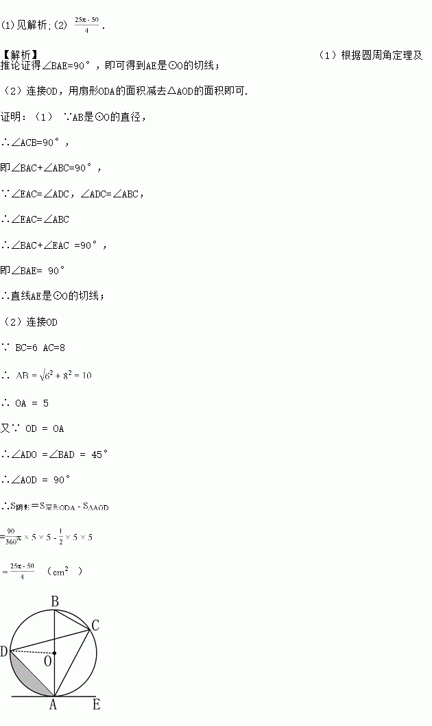 如图,已知AB是⊙O的直径,点C,D在⊙O上,BC=6cm,AC=8cm,∠BAD=45°.点E在⊙O外,做直线AE,且∠EAC=∠D.