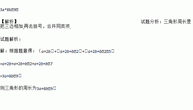 3a+8b﹣9. 【解析】试题分析:三角形周长是把三边相加,再去括号,合并同类项. 试题解析: 【解析】 根据题意得:(a+2b)+(a+2b+b﹣2)+(a+2b+b﹣2﹣5) =a+2b+a+2b+b﹣2+a+2b+b﹣7 =3a+8b﹣9, 则三角形的周长为3a+8b﹣9.