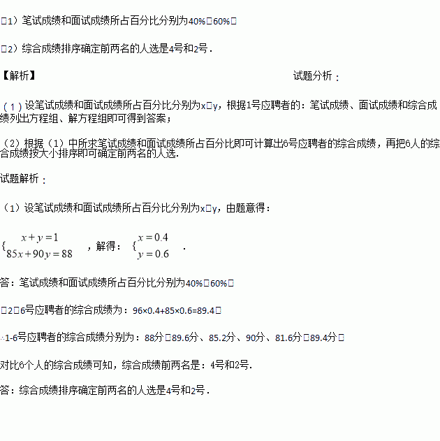 (2)若2、3、4、5号应聘者的综合成绩分别是89.6分、85.2分、90分、81.6分,请求出6号应聘者的综合成绩,并按综合成绩排序确定前两名的人选.