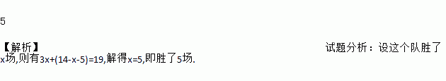 5 【解析】试题分析:设这个队胜了x场,则有3x+(14-x-5)=19,解得x=5,即胜了5场.