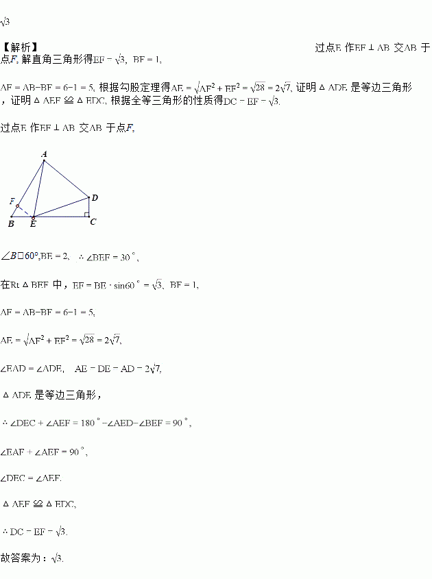 如图,四边形ABCD中,∠B=60°,∠C=90°,AB=6,AD=,E在BC上,连AE、DE,若∠EAD=∠ADE,BE=2,则DC=_______.