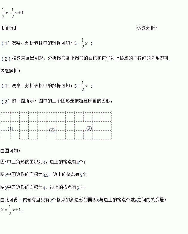 (1)上图中的格点多边形,其内部都只有一个格点,它们的面积(S)与各边上格点的个数和(x)的对应关系如下表,请写出S与x之间的关系式.答:S=_________.
