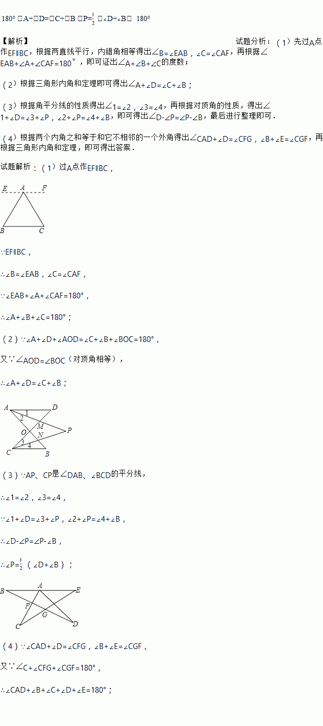 (3)若在图2的条件下,作∠DAB和∠BCD的平分线AP和CP相交于点P,并且与CD、AB分别相交于M、N(如图4).请直接写出∠P与∠D、∠B之间数量关系:____;