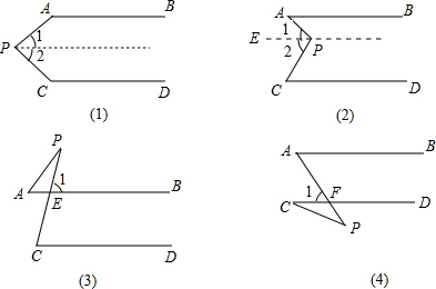 分析:(1)首先过点P作PE∥AB,由AB∥CD,即可得AB∥PE∥CD,然后根据两直线平行,同旁内角互补,即可求得答案;