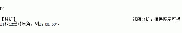 如图,直线a、b相交于点O,∠1=50°,则∠2=________度.