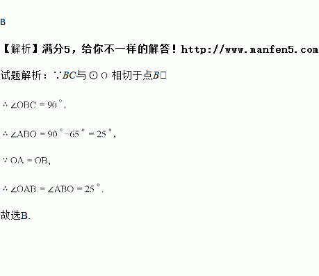 如图,AB是⊙O的弦,BC与⊙O相切于点B,连接OA,OB,若∠ABC=65°,则∠A等于( )