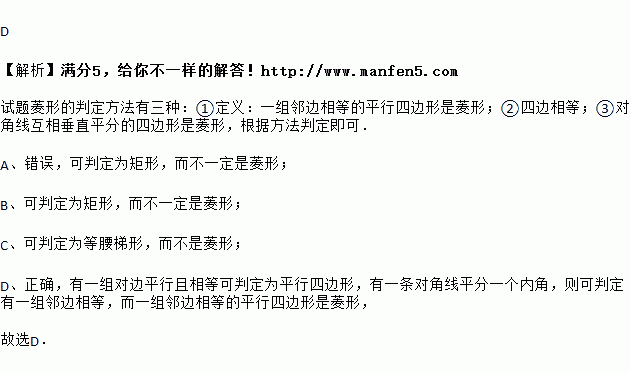D. 有一组对边平行且相等,且有一条对角线平分一个内角