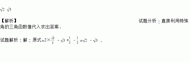 计算:2cos45°﹣tan60°+sin30°﹣|﹣|.
