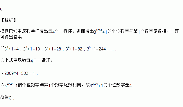 计算:31+1=4,32+1=10,33+1=28,34+1=82,35+1=244,…,归纳计算结果中的个位数字的规律,猜测32009+1的个位数字是( )