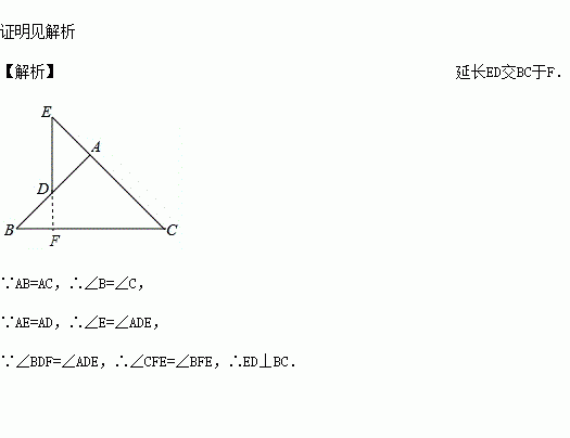 如图,已知ΔABC中,AB=AC,D是AB上一点,延长CA至E,使AE=AD.试确定ED与BC的位置关系,并证明你的结论.