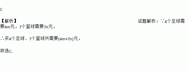 C 【解析】试题解析:∵4个足球需要4m元,7个篮球需要7n元, ∴买4个足球、7个篮球共需要(4m+7n)元, 故选C.