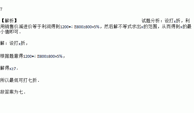 7 【解析】试题分析:设打x折,利用销售价减进价等于利润得到1200•﹣800≥800×5%,然后解不等式求出x的范围,从而得到x的最小值即可. 【解析】 设打x折, 根据题意得1200•﹣800≥800×5%, 解得x≥7. 所以最低可打七折. 故答案为七.