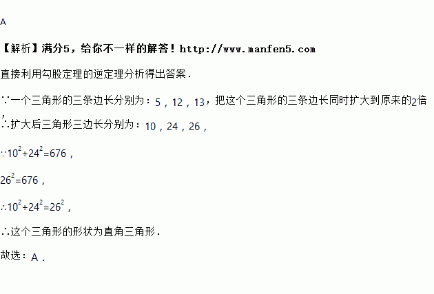 一个三角形的三条边长分别为:5,12,13,把这个三角形的三条边长同时扩大到原来的2倍,那么这个三角形的形状为( )