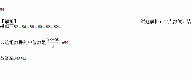 59 【解析】试题解析:∵人数统计结果如下52、54、58、60、62、62, ∴这组数据的中位数是=59, 故答案为59.