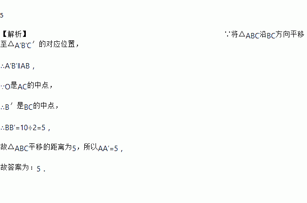 如图,在△ABC中,BC=10,将△ABC沿BC方向平移得到△A′B′C′,连接AA′,若A′B′恰好经过AC的中点O,则AA′的长度为__.