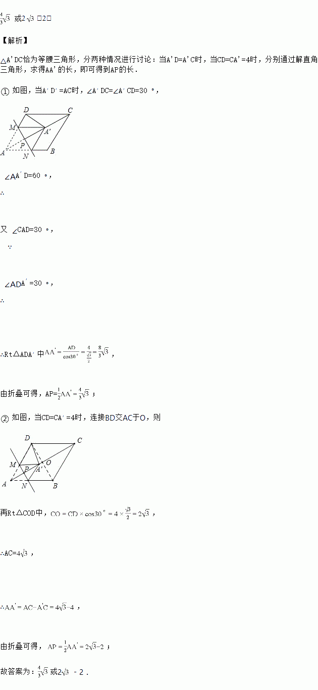 菱形ABCD的边长是4,∠ABC=120°,点M、N分别在边AD、AB上,且MN⊥AC,垂足为P,把△AMN沿MN折叠得到△AˊMN,若△AˊDC恰为等腰三角形,则AP的长为_____.